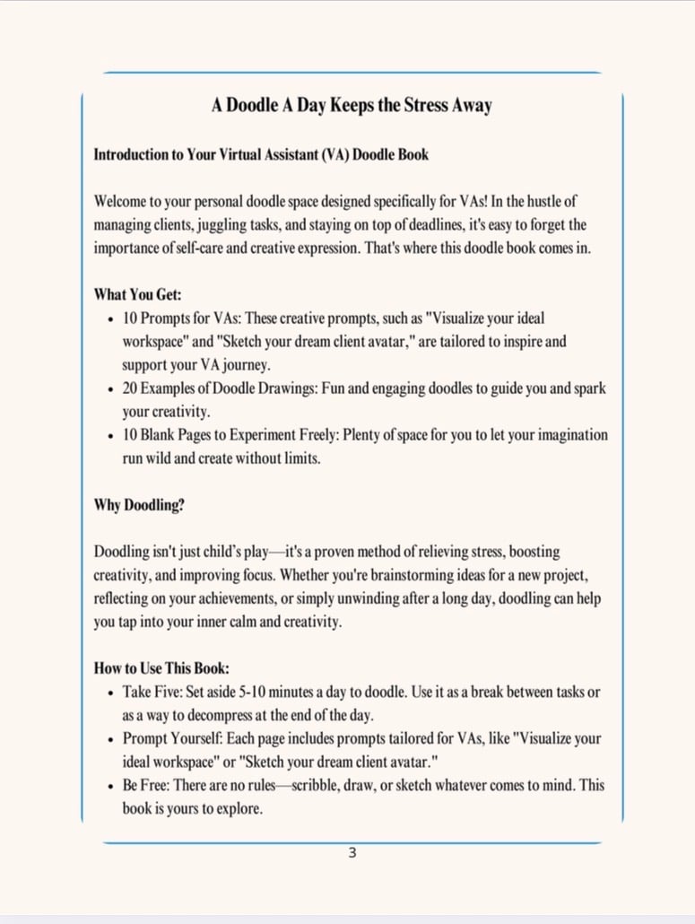 The Virtual Assistant Doodle Book is designed just for you! This book blends creativity with mindfulness, offering a unique way to spark inspiration, reduce stress, and boost productivity through doodling.